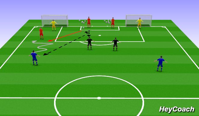 如图所示。底线的两名球员带球传球给红色球员。红色球员打门。