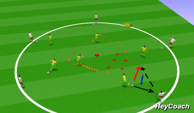Organisation: The practice startes with the player in the centre circle. He dribbles the ball 10 yards and then plays a quick 1-2 into player A. He then plays the ball into the corner area for player A to run onto. Player A crosses the ball in first time and the two strikers time their run and attempt to score.