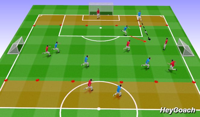 3)一组球员连续传球5次并将球踢入对方区域后得1分,然后攻守互换,进行同样的6对2练习。