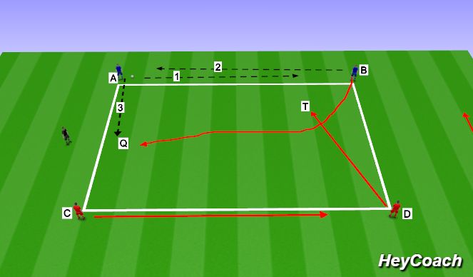 a)两两组队平均分成两组,两人间隔十米,如图A传球给B观察B并跑向C位,B得球绕过球员模型到C位传球给A,A完成射门,然后进行交换