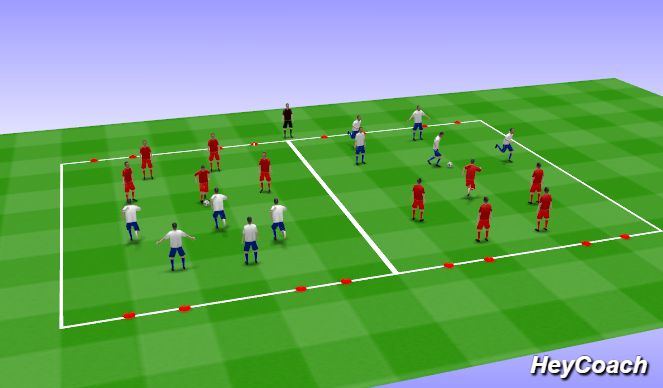 组织形式:如图所示,将场地分为大小相等的两个区域,两侧底线设置两个左右宽度的球门。两人一组在场地内进行1v1练习,进攻队员带球试图击败防守球员,并带球达到对方球门处,之后两人互换角色。如果球被抢断则进攻队员可以再获得1次机会重新开始,之后无论成功与否两名队员交换角色(进攻或防守累计失败两次即前滚翻一个)。