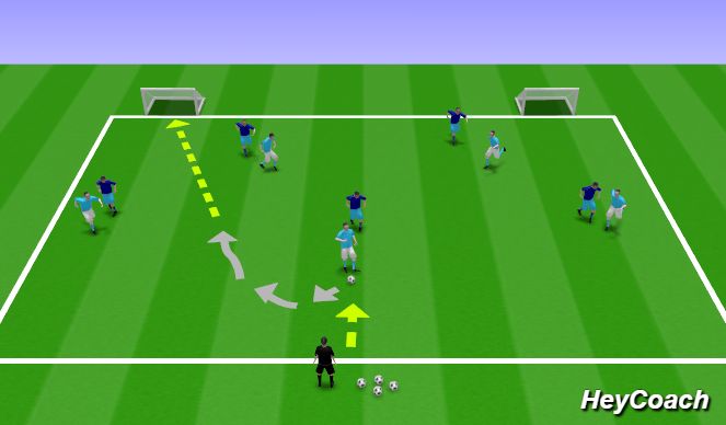 Coaching Points: Quality first touch and turns away from defender, not into defender. Quality passes, and attack either goal. If one goal is closed off, go to the other one.