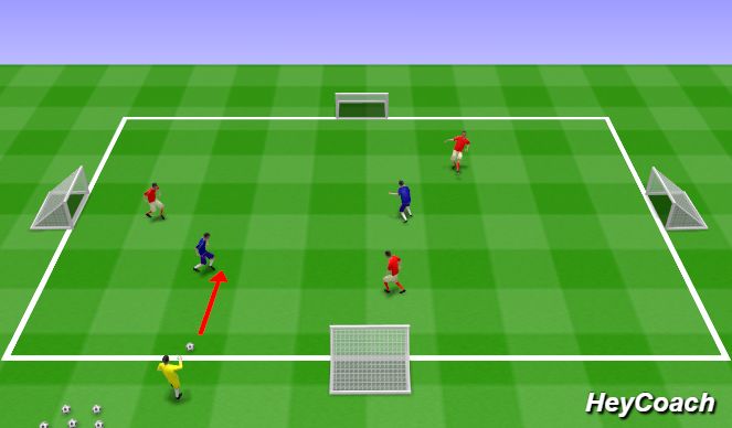 A’s combine to attack any of 4 goals, defended by 3D’s. Following goal or defensive regain of possession: play stops, players re-establish position & practice restarts from coach’s service.