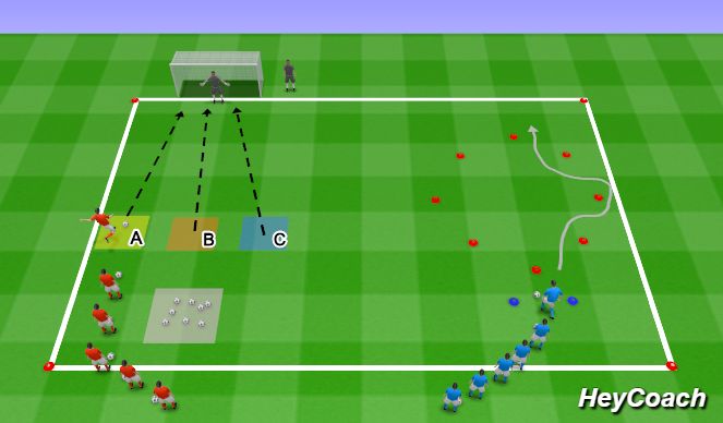 3)红队球员依次在A、B、C三个区域进行射门练习,射门区域距球门10米左右。