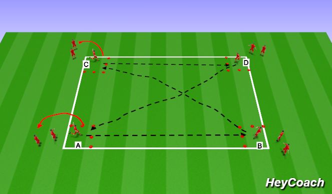 Organisation: 25x25 Area, inside this we will have 4 little areas coned off for players to recieve the ball, only 1 player allowed in area at a time, recieves, passes on to next box, making the diagonal pass a lofted one, then goes to the back of line as shown above. Let all players have a go at switching the ball clockwise and anti clockwise. Can also have more than 1 ball in to keep tempo going, get players to follow their runs, and add a man in centre of pitch to recieve and do the switch.