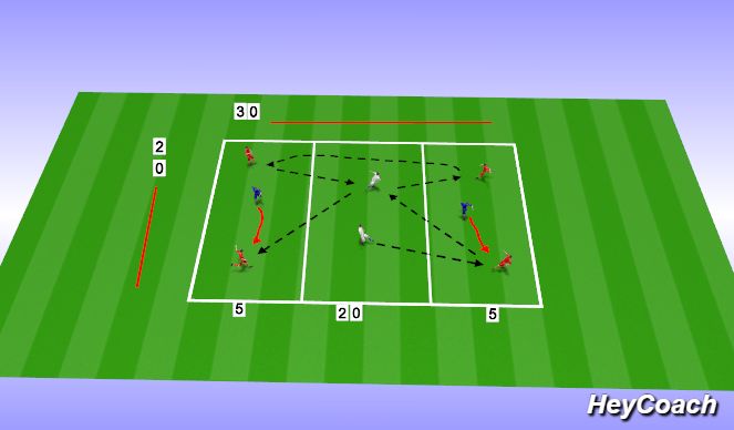 Organisation: Area of 20x30 split into 3, giving 2 end zones of 5x20. Organise 2v1 in each end zone, plus feeders in the centre, feeders pass to end zone player who can pass back or to other team mate, Once space is made, end zone player is to switch the ball to the other end zone.